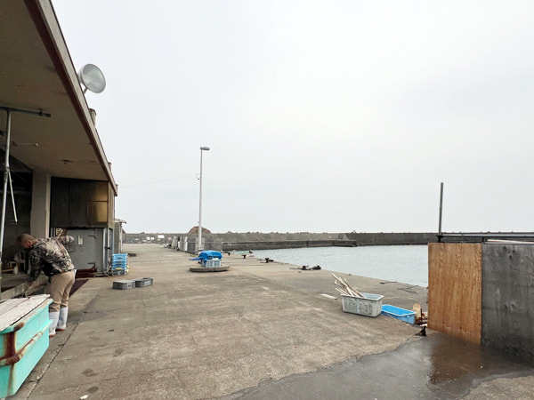 ⑪漁港の建物前から出船。国崎の船が順番に船を着けるので、功成丸が船を着けるのを待つ
